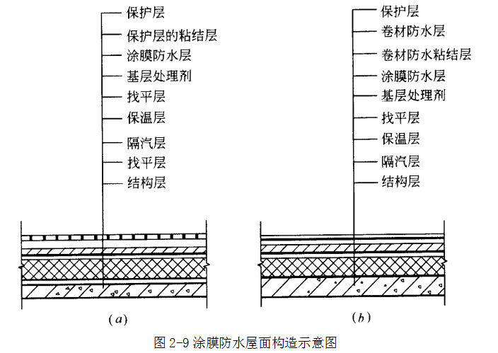 (a)涂膜防水屋面構(gòu)造;(b)涂膜與卷材復(fù)合防水屋面構(gòu)造