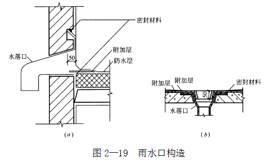 雨水口分為設(shè)在天溝、檐溝底部的水平雨水口和設(shè)在女兒墻上的垂直雨水口兩種。無(wú)論在什么部位,構(gòu)造上都要求它排水通暢防止?jié)B漏和堵塞。雨水口通常采用鑄鐵或塑料制品的漏斗形定型配件,上設(shè)格柵罩。圖2-21(a)、(b)分別為橫式雨水口和直式雨水口。