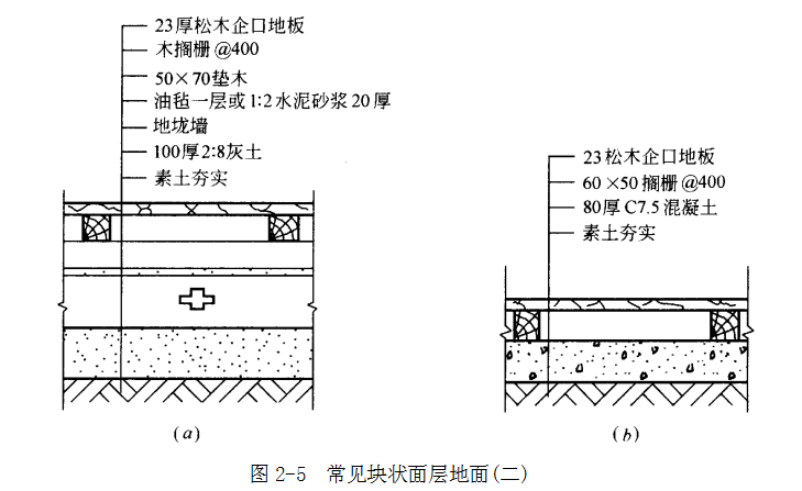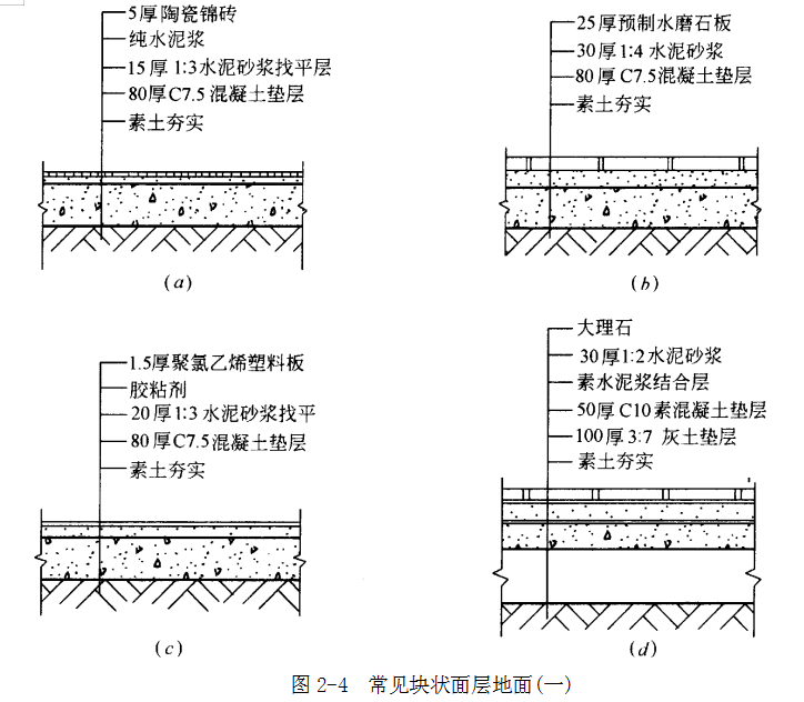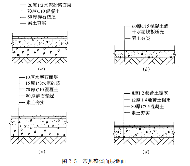 整體地面的面層是一個(gè)整體。它包括水泥砂漿地面、混凝土地面、水磨石地面、菱苦土地面等。如圖2-5所示。