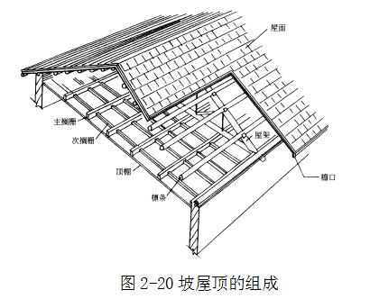 坡屋頂一般由承重結(jié)構(gòu)(承重層)和屋面(防水層)兩部分組成,根據(jù)不同的使用要求還可以設(shè)置保溫層、隔熱層及頂棚層等(圖2-20)。