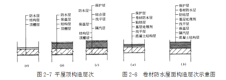 圖2-7 平屋頂構(gòu)造層次 圖2-8 卷材防水屋面構(gòu)造層次示意圖