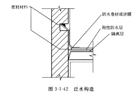 剛性防水屋面,防水層與墻體交接處應(yīng)留有30mm的縫隙,并用密封材料嵌填,泛水處應(yīng)鋪設(shè)卷材或涂膜附加層(圖2-13)。