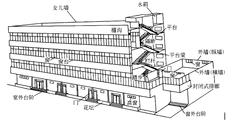 ????一幢房屋,盡管它們?cè)谑褂靡?、空間組合、外形處理、規(guī)模大小等各不相同,但是構(gòu)成建筑物的主要組成部分是相同的,它們包括基礎(chǔ)、墻和柱、樓地層、樓梯、屋頂和門窗等。如圖2-3所示,是某校四層辦公樓的各組成部分。