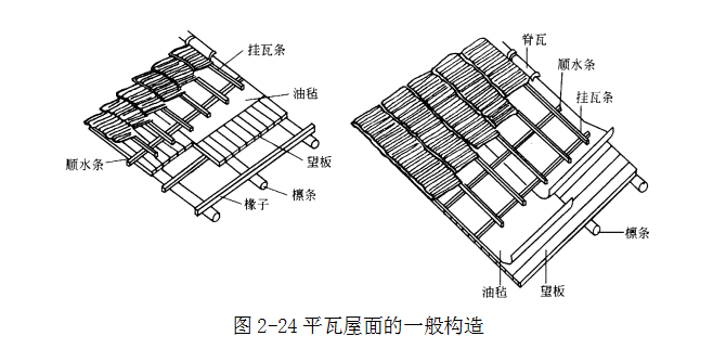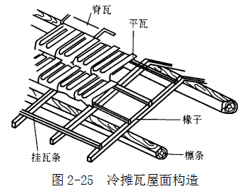 當(dāng)坡屋頂?shù)奈菝嬗蓹_條、椽子、屋面板、防水材料、順?biāo)畻l、掛瓦條、平瓦等層次組成時(shí),我們稱之為平瓦屋面。其中當(dāng)檁條間距較小(一般小于800mm)時(shí),可直接在檁條上鋪設(shè)屋面板,而不使用椽子(圖2-25)。