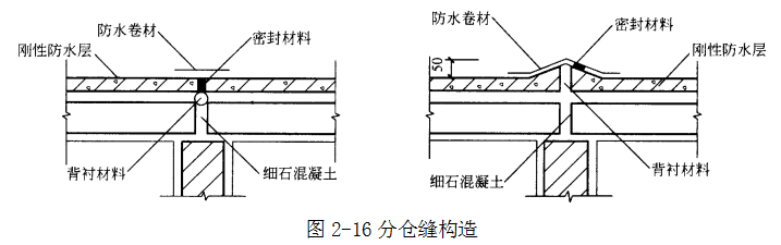 分倉(cāng)縫的寬度宜為20~40mm,分倉(cāng)縫的常用構(gòu)造做法見圖2-18。