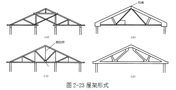 (a)四支點(diǎn)木屋架;(b)鋼木組合豪式屋架;(c)、(d)預(yù)制鋼筋混凝土屋架