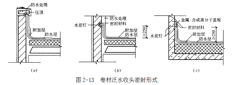 (a)卷材泛水收頭;(b)磚墻卷材泛水收頭;(c)混凝土墻卷材泛水收頭
